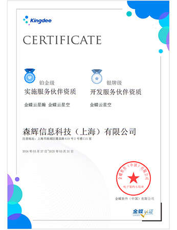 森輝信息科技(上海)科技有限公司成立于2014年2月,是金蝶國際在上海區(qū)域優(yōu)質(zhì)的鉑金服務(wù)商;伙伴編碼20021001,可在金蝶官方網(wǎng)站上查詢。森輝公司是以上海金蝶軟件公司的銷售及實(shí)施部人員為班底,與金蝶軟件公司緊密合作,為金蝶新老客戶提供可靠的軟件產(chǎn)品(EAS、云星空、k/3 wise)和優(yōu)質(zhì)的服務(wù)為己任。